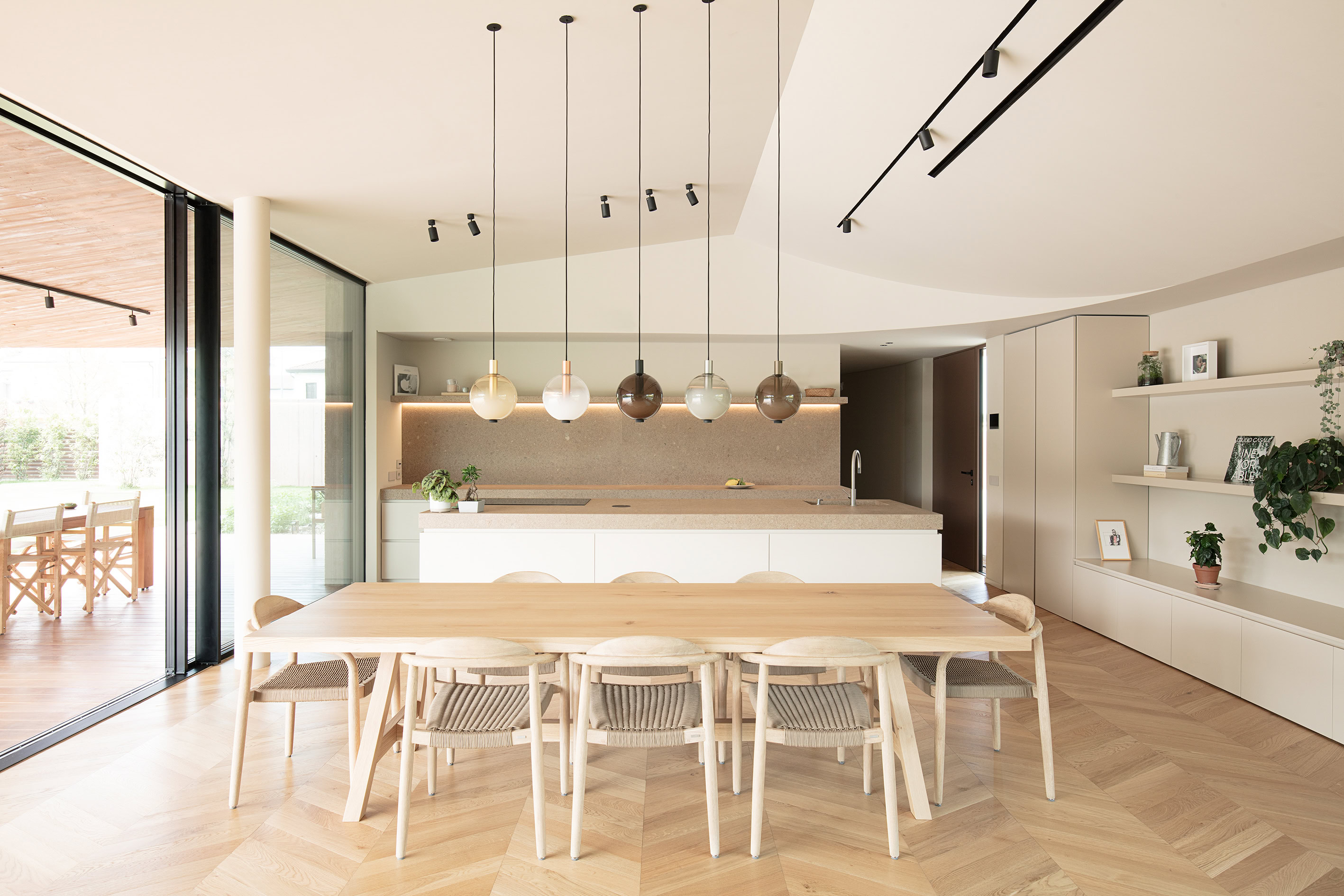 Gli interni sono definiti da ampie vetrate che garantiscono un costante dialogo tra spazi domestici e paesaggio esterno. La luce naturale diventa protagonista, filtrando negli ambienti e amplificando la percezione della continuità tra dentro e fuori. L’atmosfera che ne deriva è al tempo stesso sobria ed elegante, espressione di un’architettura residenziale capace di fondere tradizione costruttiva veneta e linguaggio contemporaneo.