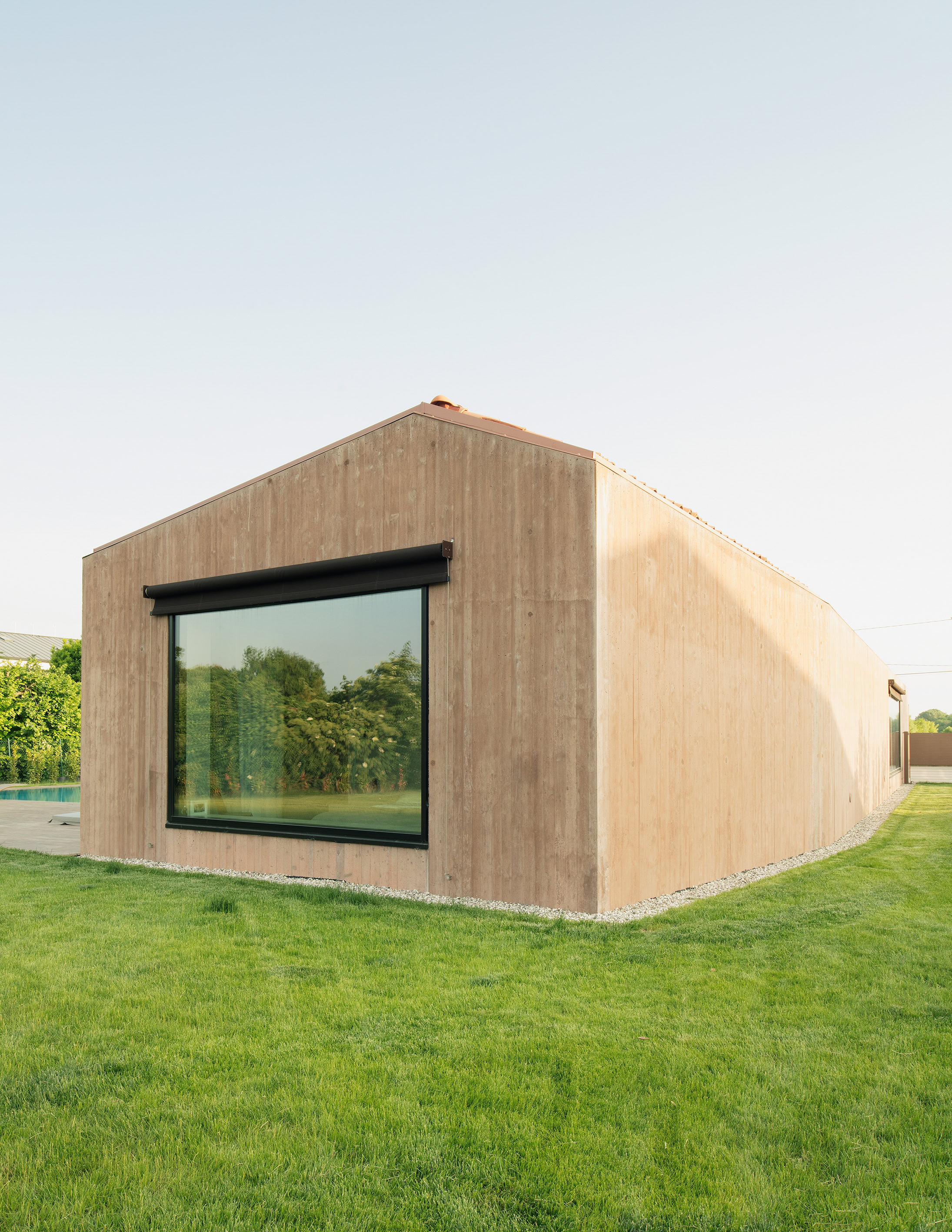 Il linguaggio architettonico della villa coniuga semplicità ed essenzialità, restituendo un’immagine ordinata e rigorosa. La copertura a due falde in coppi evoca i casolari rurali della tradizione veneta, reinterpretati in chiave contemporanea. Questo elemento, apparentemente tradizionale, acquista un carattere moderno grazie alle proporzioni controllate e alla continuità con il volume principale.