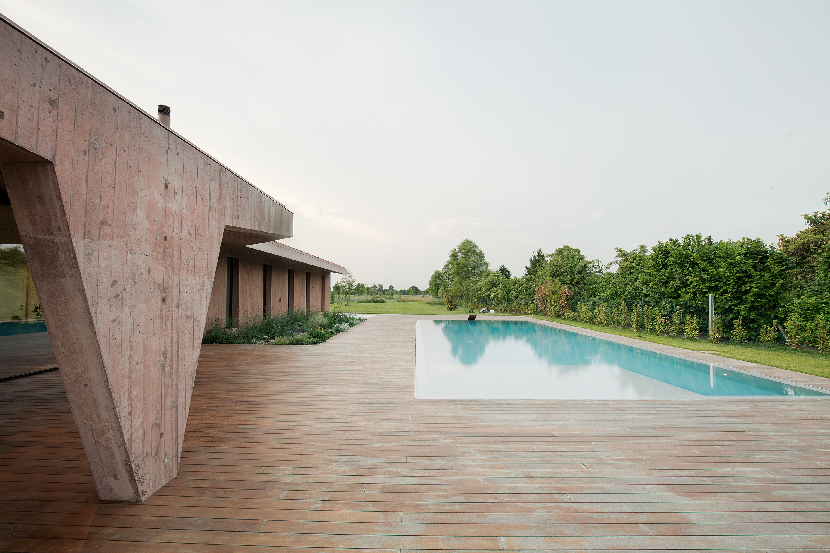 L’abitazione si inserisce con discrezione nel contesto rurale sfruttando la particolare conformazione del lotto, una striscia di terra stretta e allungata. La pianta è stata studiata per ridurre al minimo gli spazi di distribuzione e garantire la massima efficienza funzionale, con ambienti ampi e luminosi che si aprono direttamente verso il giardino e la piscina.