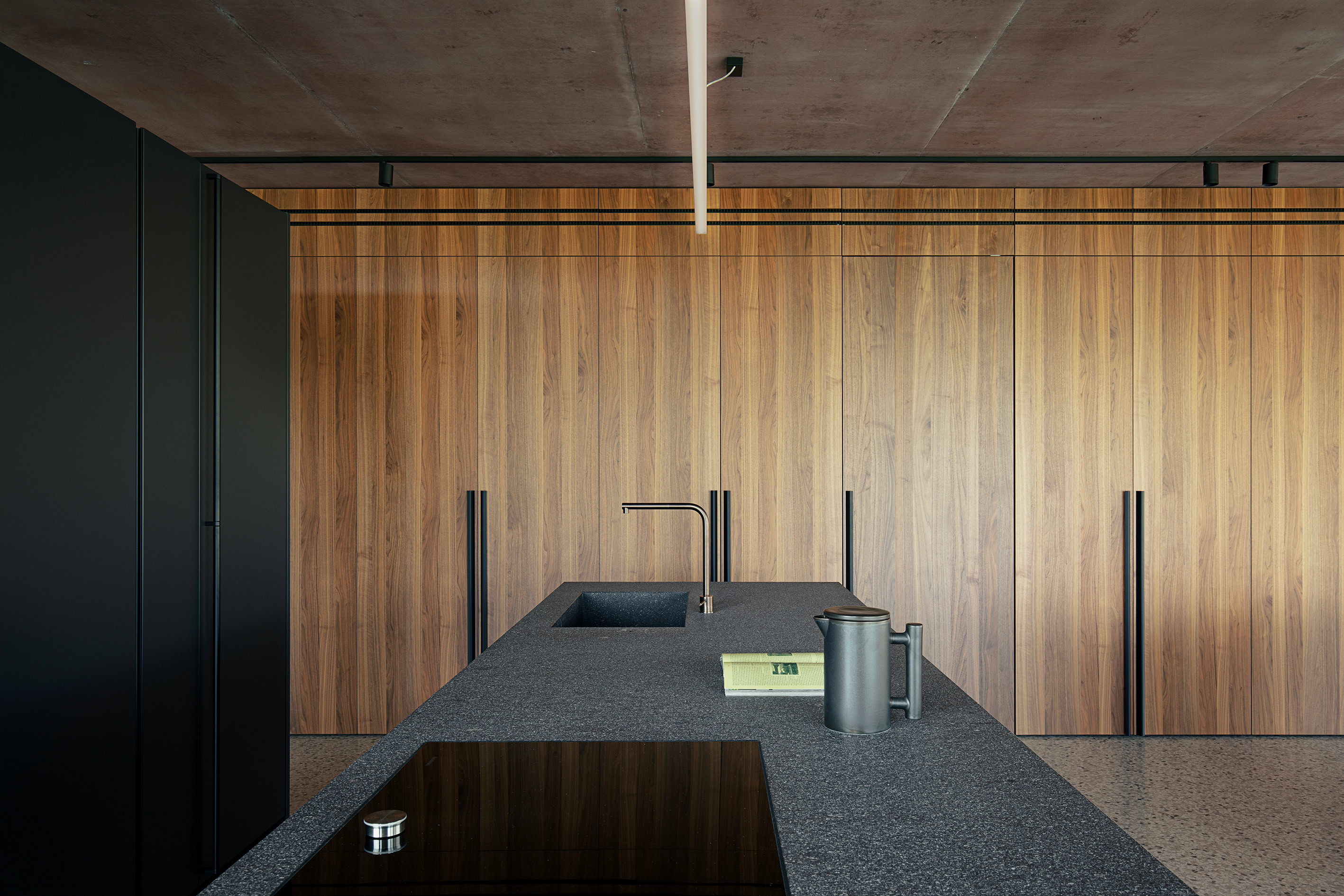 Il linguaggio materico è essenziale e coerente: vetro, legno e calcestruzzo pigmentato in tonalità rossastre dialogano armoniosamente con la pavimentazione in terrazzo alla veneziana, contribuendo a definire un’estetica moderna, elegante e radicata nel contesto.