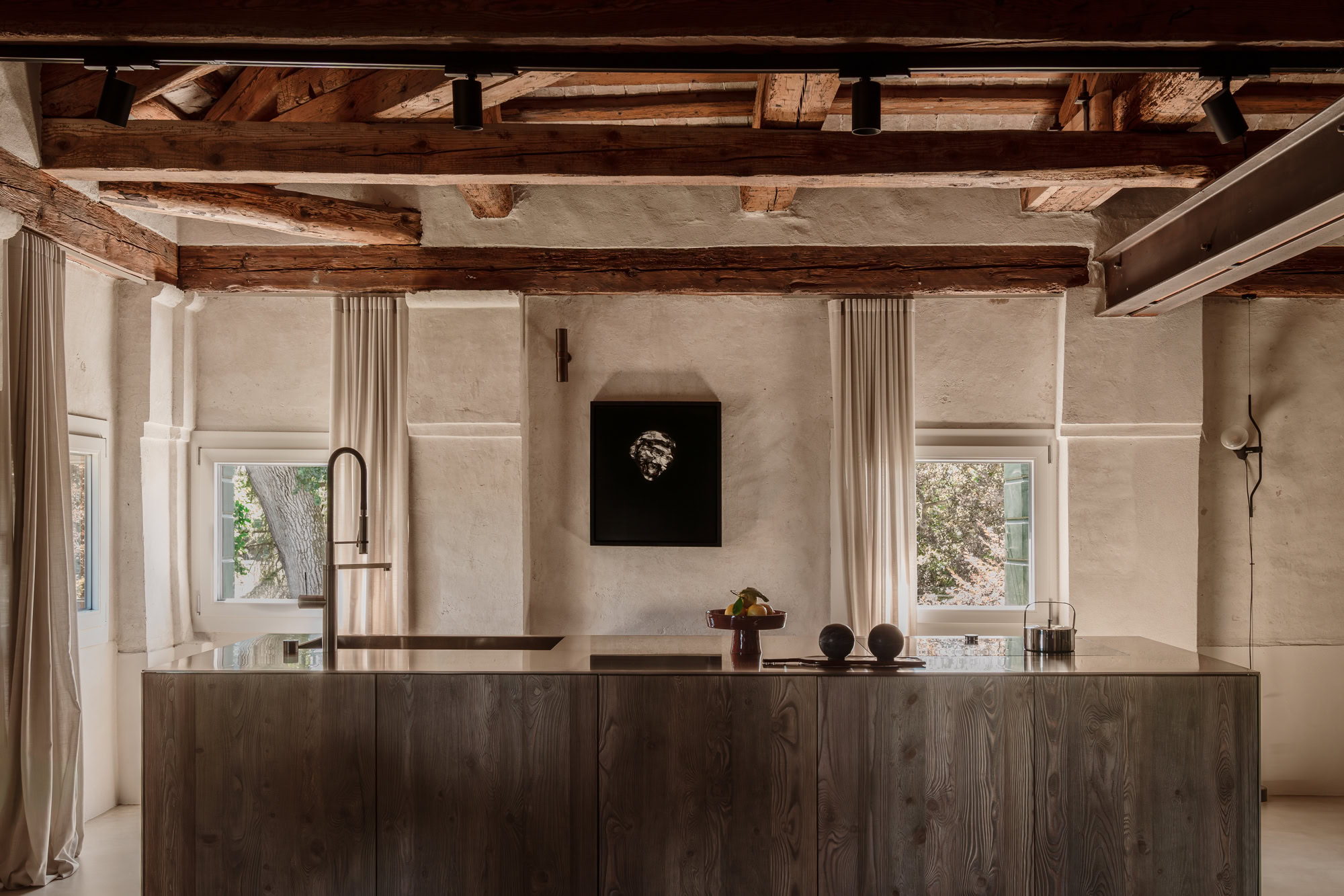 Una scala centrale conduce al soppalco, spazio ibrido tra studio e area relax, che si apre direttamente sull’abbaino della facciata principale. La pavimentazione in resina neutra, le travi lignee scure e gli intonaci restaurati definiscono un equilibrio materico misurato, in cui i volumi interni – volutamente più bassi delle travi – preservano la continuità dello spazio.