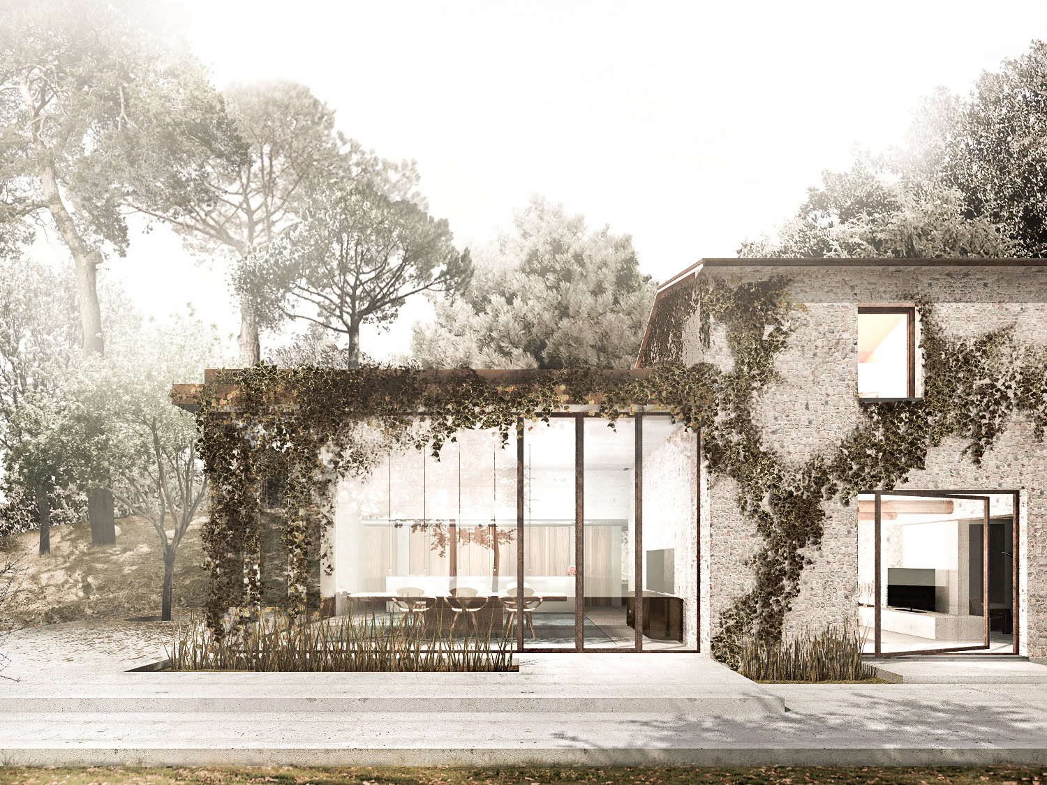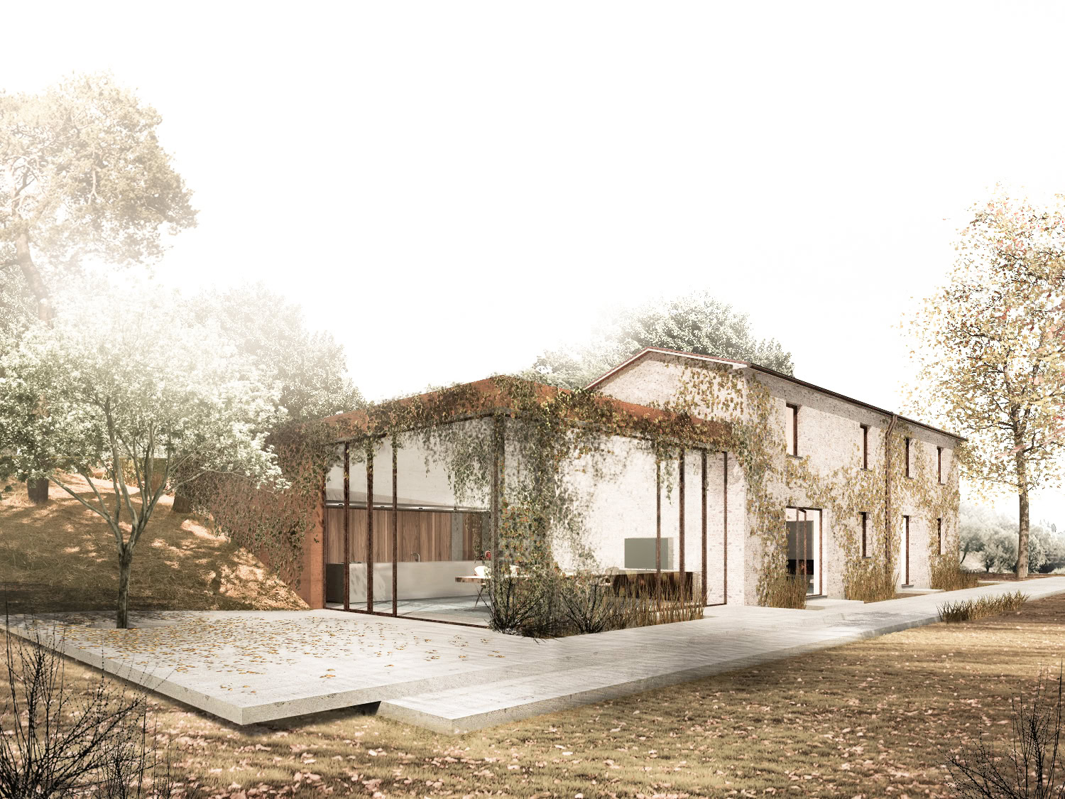Il corpo centrale, un rustico in mattoni di inizio Novecento, viene mantenuto e restaurato con attenzione artigianale, mentre le superfetazioni più recenti vengono ripensate attraverso un linguaggio architettonico contemporaneo. Il progetto si concentra sul dialogo tra antico e nuovo, creando una continuità visiva e materica che permette all’edificio di inserirsi in maniera armoniosa nel paesaggio toscano.