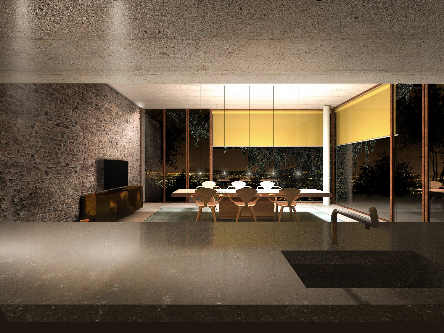 Gli interni sono studiati per offrire un equilibrio tra spazi intimi e conviviali. Al piano terra si trovano ambienti dedicati al relax e al tempo libero, come una sala lettura, una sala giochi, un soggiorno con vista e una spa privata. La cucina e la zona pranzo sono collocate in un nuovo volume aperto verso il panorama, così da favorire un legame diretto tra l’abitare e la natura circostante. Un secondo volume accoglie la dependance per gli ospiti autonoma ma collegata al corpo principale.