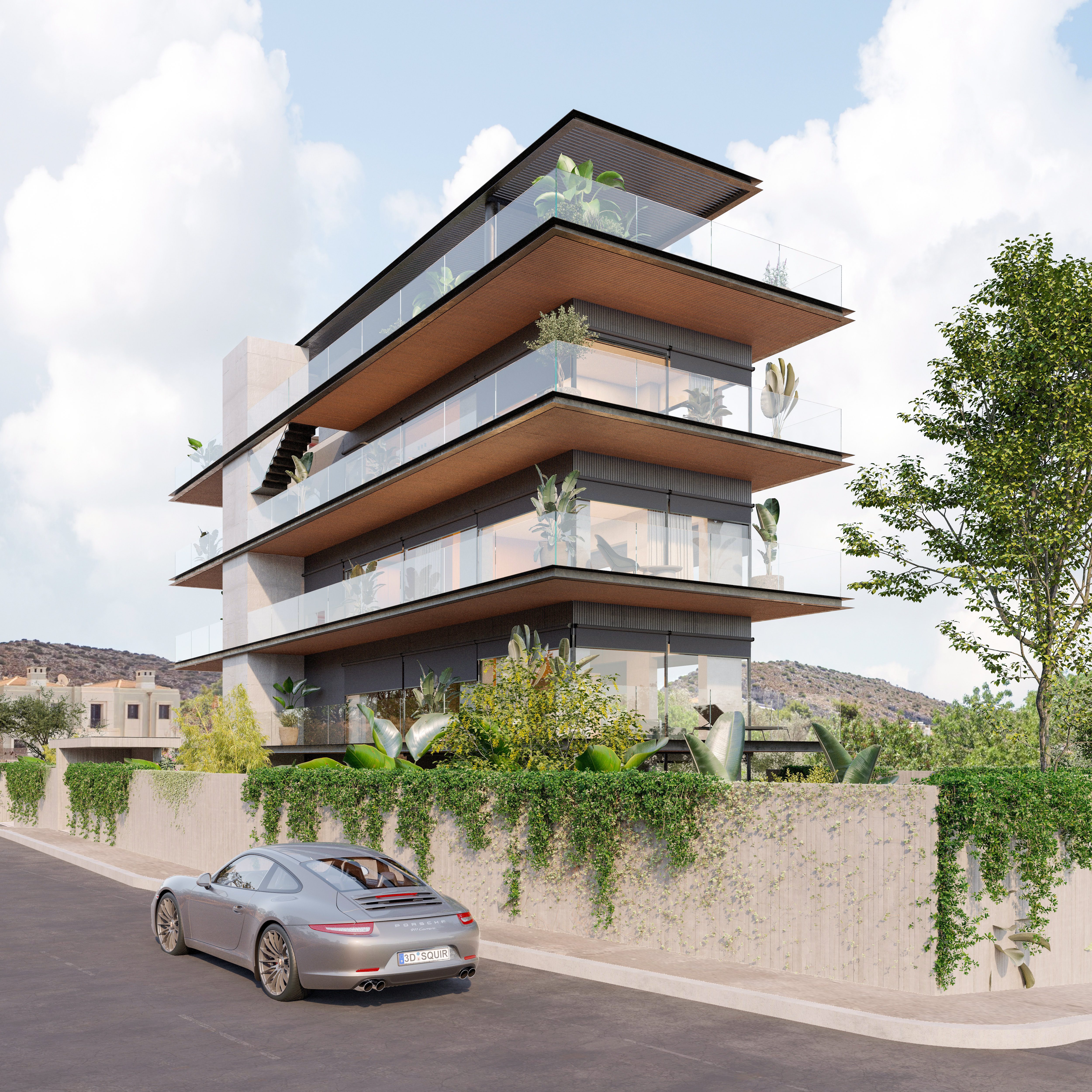 La scelta dei materiali enfatizza il linguaggio contemporaneo della residenza: il calcestruzzo, il legno e il vetro si combinano per creare spazi luminosi e raffinati. I parapetti in vetro con marcapiano in metallo conferiscono leggerezza e trasparenza, mentre all’interno gli stessi materiali continuano a definire un’estetica coerente e sofisticata.